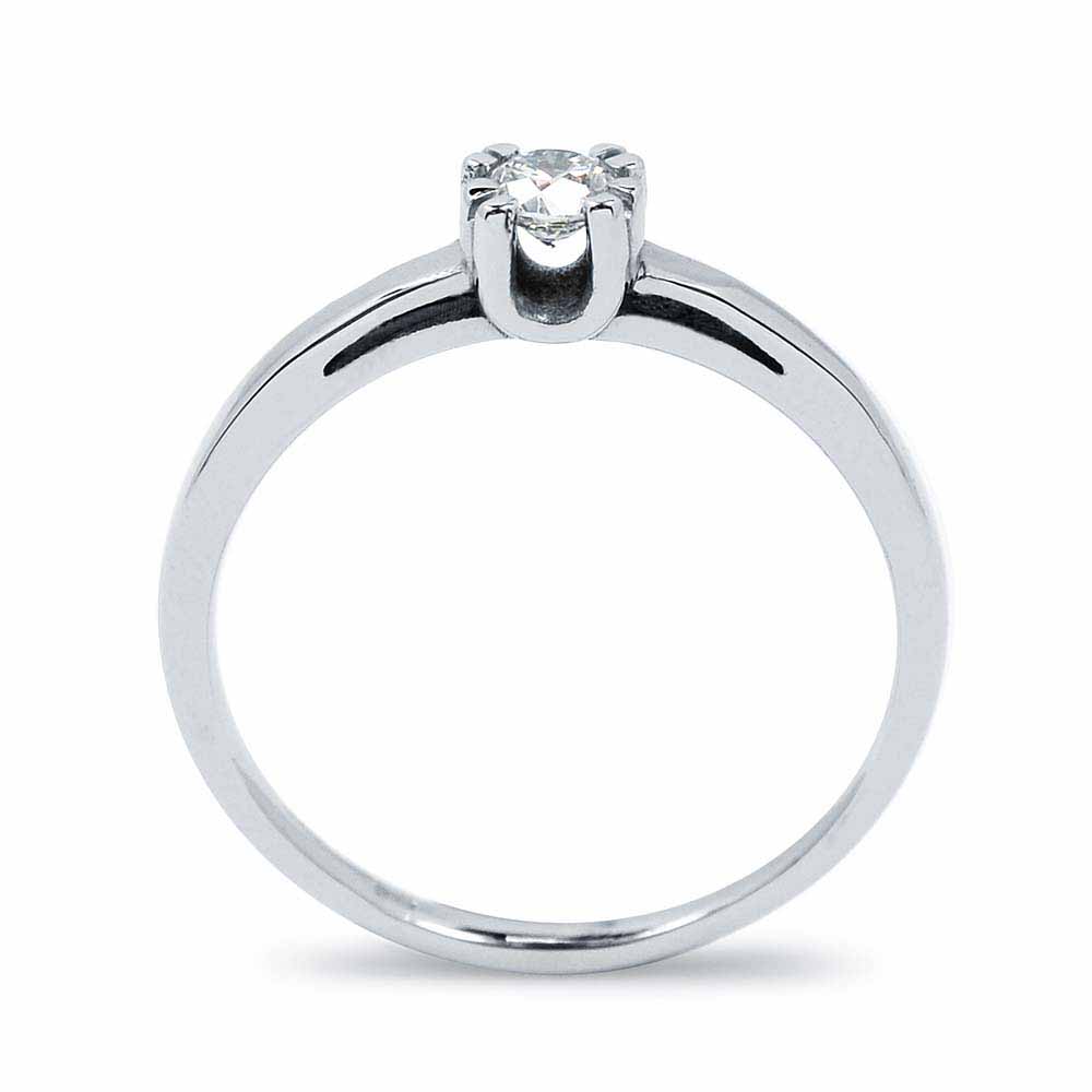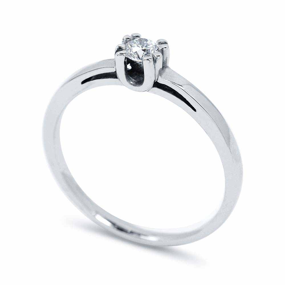 Szépséges, 14 karátos fehérarany eljegyzési gyűrű, 3,8mm-es briliáns csiszolású gyémánttal. A tündöklő drágakövet négy, dupla karom tartja biztonságban, melyeket kettéváló elegáns sín rész fog közre. A gyémánt kő súlya 0,2 karát, színe 'F', tisztasága 'VS1'. A gyémánt gyűrű teljes súlya 1,6 gramm. Díjmentesen méretre igazítjuk szükség esetén, akár utólag is. Jelenleg megrendelésre.