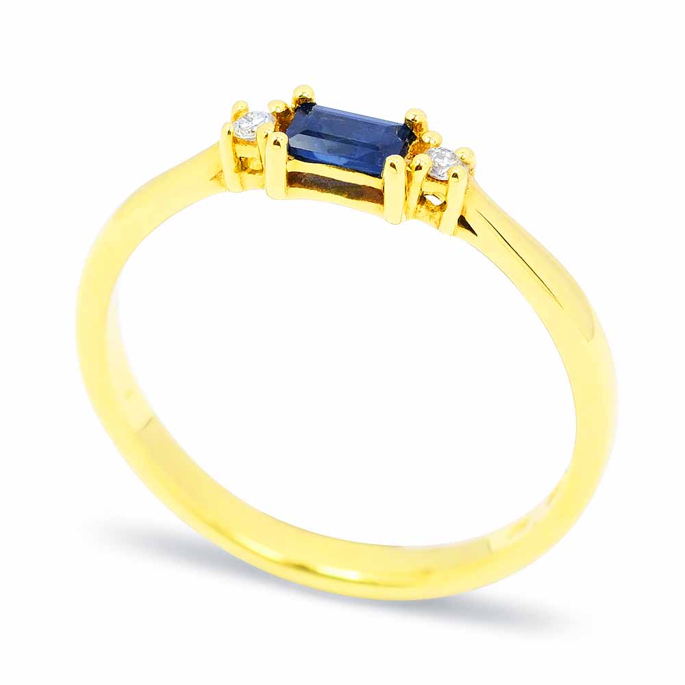 Középen sötétkék zafír kővel foglalt gyűrű 14 karátos aranyból készítve. A zafír hosszúkás, téglalap formára van megcsiszolva, súlya több, mint 0,2 karát. A kék drágakő mellett egy-egy gyémánt csillog. Akár különleges eljegyzési gyűrűnek is ajánljuk! Kérésre díjmentesen a szükséges ujjméretre igazítjuk. A zafír gyűrű súlya 1,9 gramm. Ha még több érdekel a zafír kövekről: Zafír ékszer - Uralkodói vér az örökkévalóságban. Készletről megvásárolható.