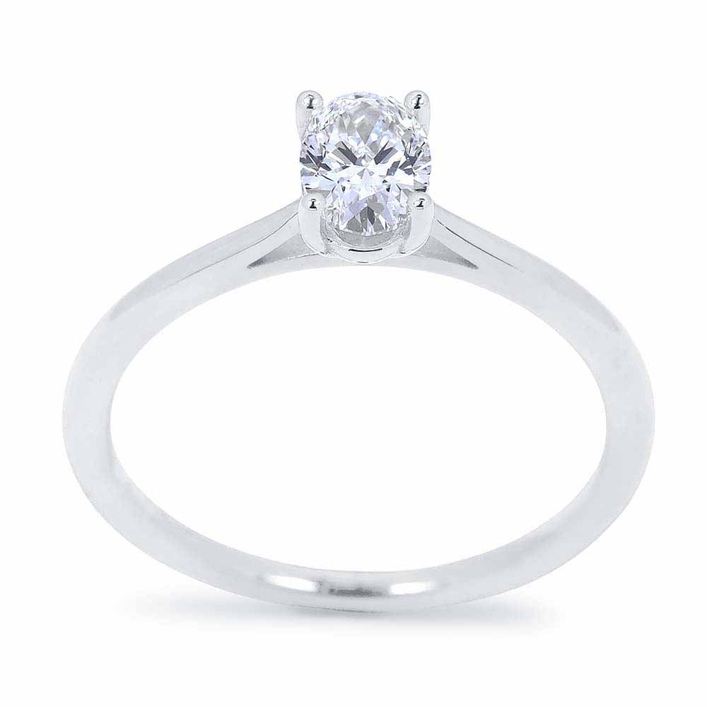 Szoliter stílusú ovális gyémánt eljegyzési gyűrű 14 karátos fehéraranyból készítve, szépséges négykarmos foglalattal
