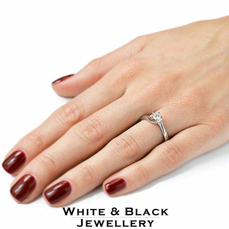 Elegáns, csavart stílusú eljegyzési gyűrű 4,1mm-es átmérőjű briliáns csiszolású gyémánttal. A több, mint 0,26 karátos központi drágakövet teljesen egyedi, ívelt ötágú foglalat öleli körbe, mely egybeolvad a gyűrű sín részével. A gyémánt hófehér (F színű), tisztasága magas minősítésű (VS1). A gyémánt gyűrű 14 karátos fehér aranyból készült. A gyémántgyűrű teljes súlya 2,7 gramm. Szükség esetén díjmentesen állítunk a gyűrű méretén. Készletről megvásárolható.