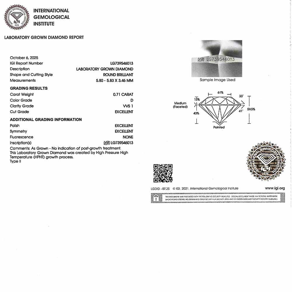 • Egy darab 5,8mm-es, briliáns csiszolású, mesterséges gyémánt (0,71 karát, D szín, VVS1 tisztaság, IGI certifikát, 3xExcellent)