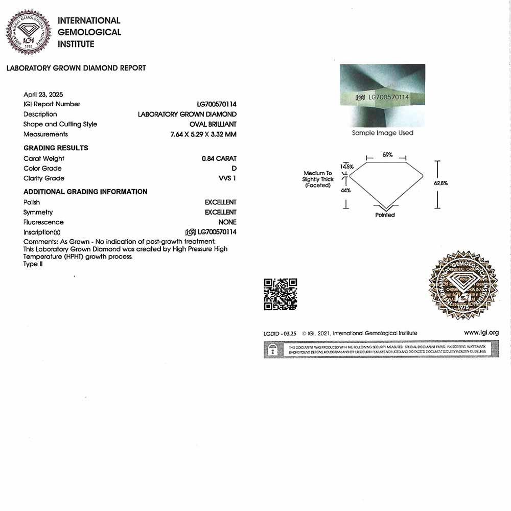 - Egy 7,6x5,3mm-es, ovális csiszolású, mesterséges gyémánt (0,8 karát, D szín, VVS1 tisztaság, Excellent csiszolás, IGI certifikát)