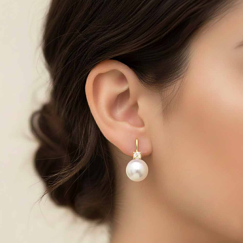 7,5-8mm-es valódi sósvizi igazgyöngyökkel és 2,5mm-es átmérőjű briliáns csiszolású gyémántokkal foglalt fülbevaló. A gyöngy fülbevaló 14 karátos aranyból készült, magas minőségű (AAA) japán akoya gyöngyökkel. A két gyémánt súlya 0,13 karát, szintén magas minősítésűek (F, VS1). Kapcsos (patent) zárral rögzül. A gyöngy fülbevaló súlya összesen 3,6 gramm. Gyöngy ékszer szett: fülbevaló és medál. Jelenleg megrendelésre.