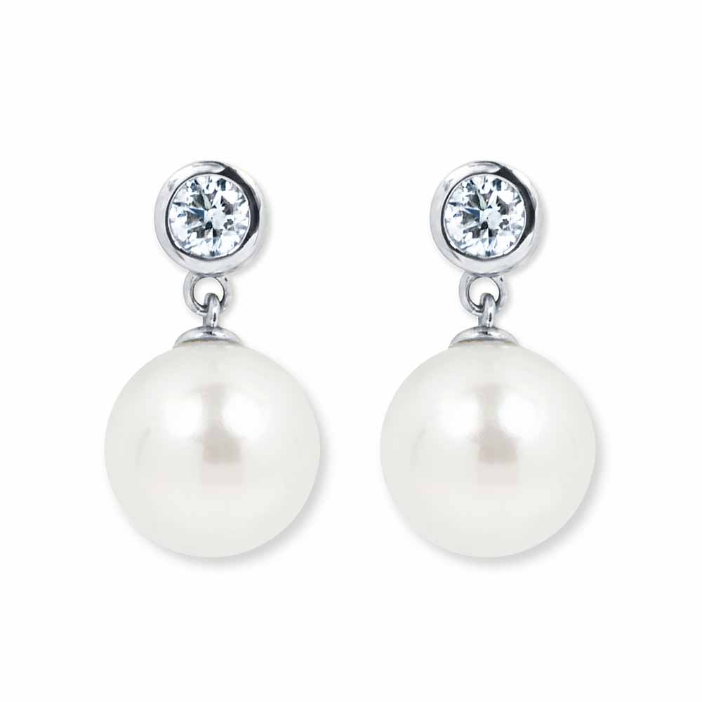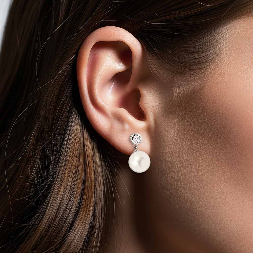 Igazgyöngy fülbevaló 7mm átmérőjű édesvízi gyöngyökkel, melyeket bouton foglalatos gyémánt ékesít - 14K fehérarany