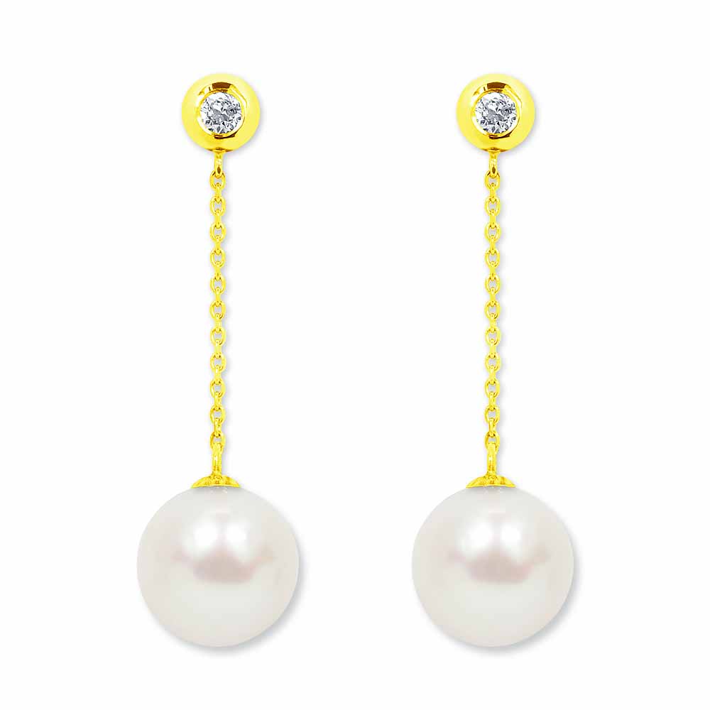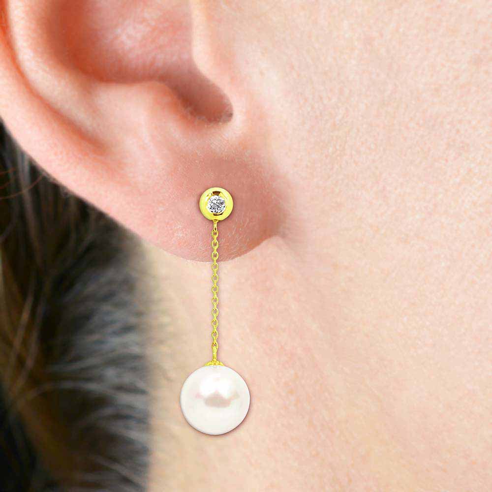 Sósvízi akoya gyöngy lógós fülbevaló aranyból készítve, két briliánssal buton foglalatban