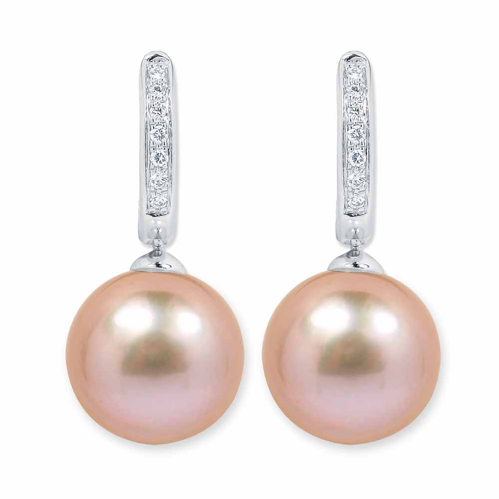 Gyémántokkal kirakott fülbevaló 10,0mm átmérőjű rózsaszín édesvízi igazgyöngyökkel, fehéraranyból