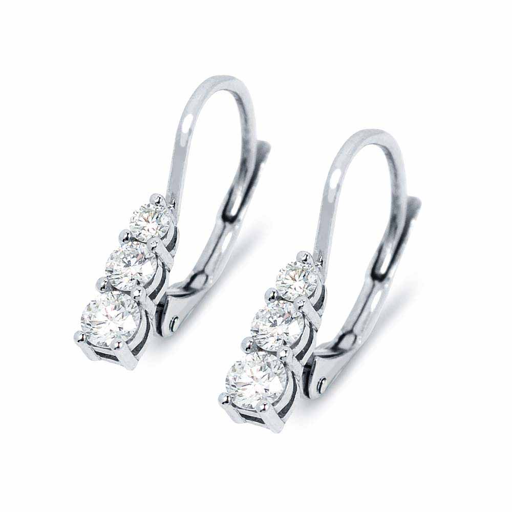 Szépséges fülbevaló 3-3 darab 2,0, 2,5 és 3,0mm-es briliáns csiszolású gyémánt kővel. A gyémántok fentről lefelő növekvő sorban követik egymást, mindegyiket külön karmos foglalat tartja. A gyémánt fülbevalóban összesen több, mint 0,4 karátnyi gyémánt csillog. Mindegyik gyémánt magas minősítésű, 'F' szín és 'VS' tisztaság besorolással rendelkezik. 14 karátos fehér aranyból készült és kapcsos zárral rögzül, a pár súlya 1,6 gramm. Keresd a hozzá illő nyakláncot is! Jelenleg megrendelésre.