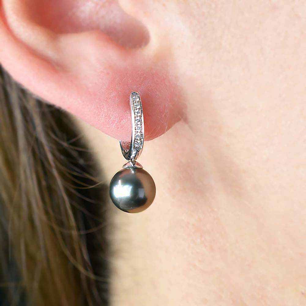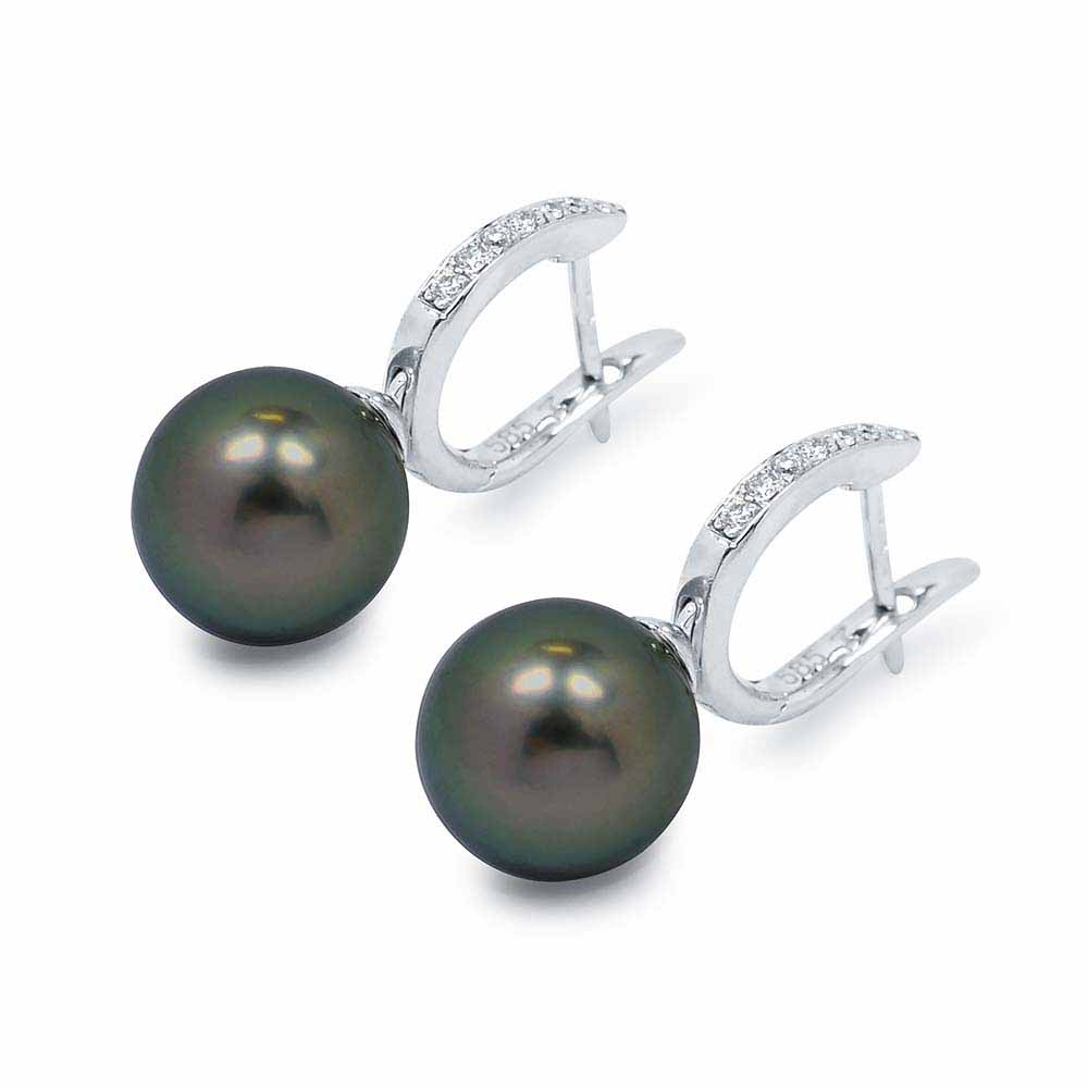 Valódi, 8-8,5mm átmérőjű, magas minőségű (AAA) tahiti igazgyönggyel készített fülbevaló. A tahiti gyöngyöknek természetes, irizáló sötét szürke színük van zöldes-fekete árnyalattal. A fülbevaló felülső részét 7-7 darab briliáns csiszolású gyémánt díszíti és 14 karátos fehér aranyból készült. Az igazgyöngyök felülete hibátlan és szabályos kerek formájúak. A gyöngy fülbevaló pár teljes súlya 4,4 gramm és kettényitható a könnyű behelyezés végett. Jelenleg megrendelésre. A tahiti gyöngyökről: Fekete igazgyöngyök - A tahiti gyöngyök rejtélye