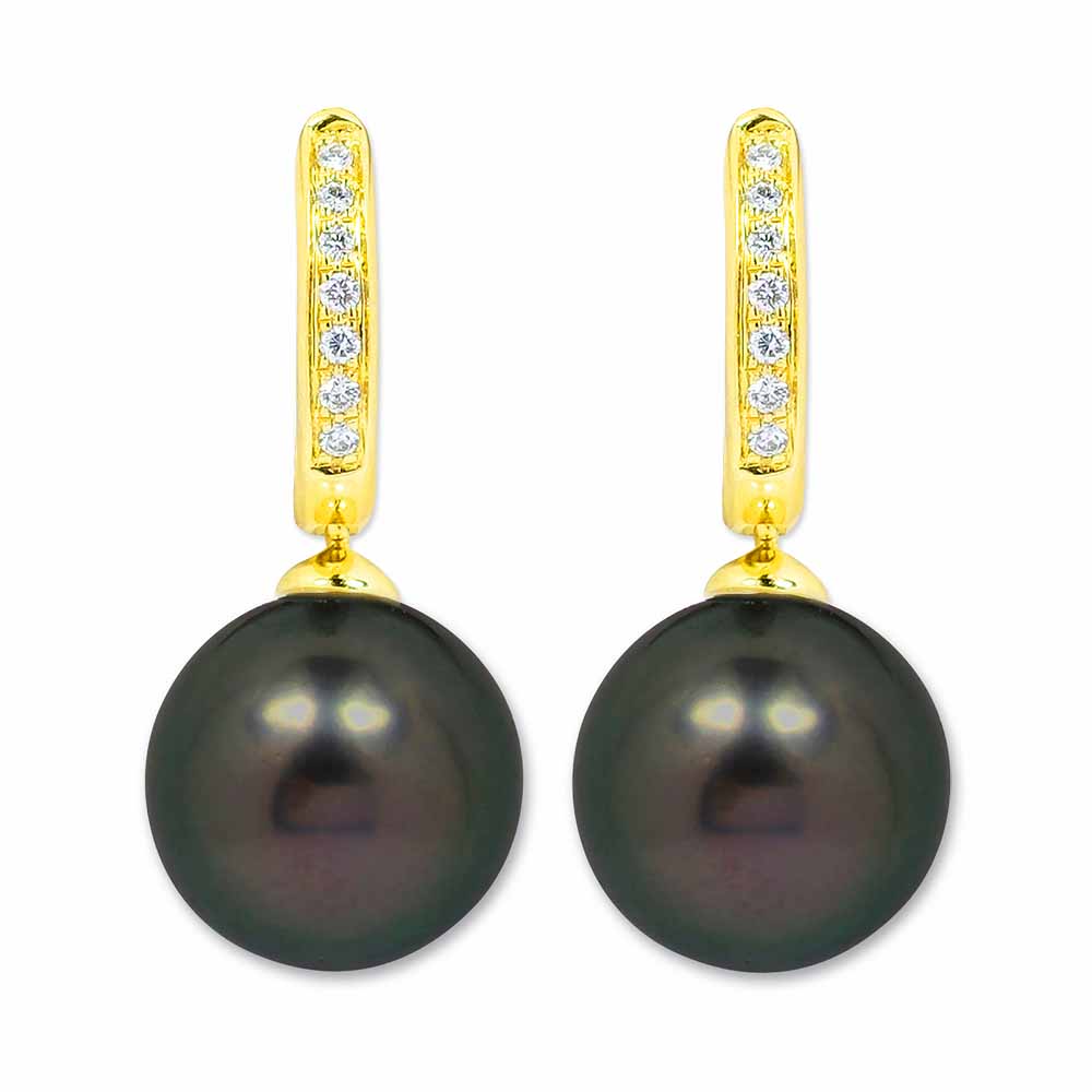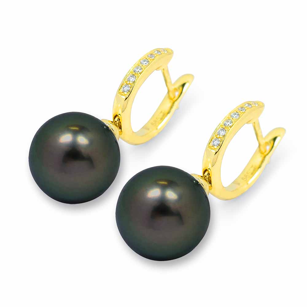 Valódi, 10mm átmérőjű, magas minőségű (AAA) tahiti igazgyönggyel készített fülbevaló. A tahiti gyöngyöknek természetes, irizáló sötét színük van zöldes-fekete árnyalattal. A fülbevaló felülső részét 7-7 darab briliáns csiszolású gyémánt díszíti és 14 karátos aranyból készült. Az igazgyöngyök felülete szinte hibátlan és szabályos kerek formájúak. A gyöngy fülbevaló pár teljes súlya 5,4 gramm és kettényitható a könnyű behelyezés végett. Készletről megvásárolható. A tahiti gyöngyökről: Fekete igazgyöngyök - A tahiti gyöngyök rejtélye