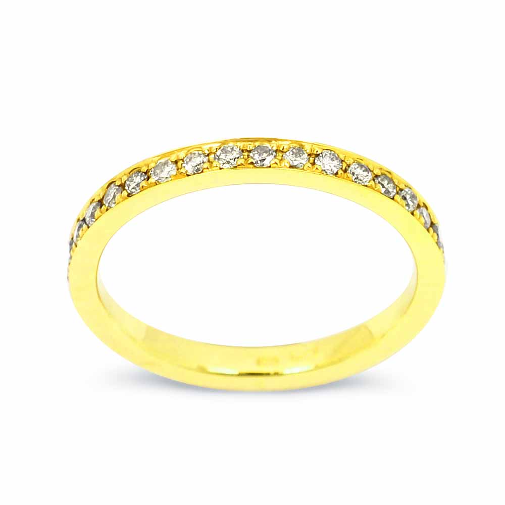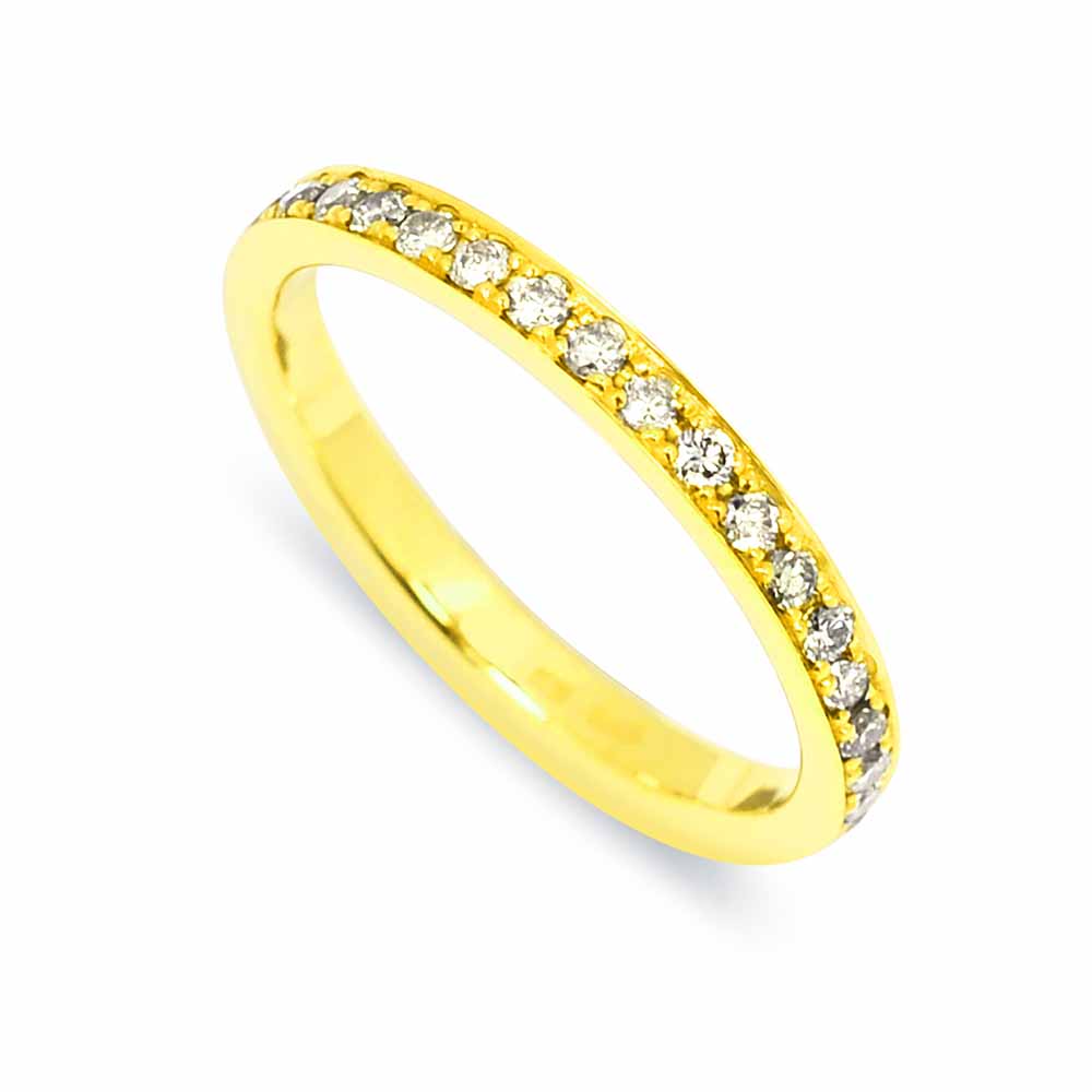 Több, mint 0,3 karát, 1,5mm átmérőjű, briliáns csiszolású gyémántokkal körbe foglalt arany eternity gyémánt gyűrű. A gyűrűt 23 darab gyémánt díszíti, melyek két vékony perem között egymás mellett sorakoznak, színük F-G, tisztaságuk VS besorolású. A gyűrű 14 karátos aranyból kézzel készült, 1,5cm kihagyással nincsenek kövek, hogy a méretén 2-3 számot lehessen változtatni (53-as méretnél). Megrendelhető teljesen körbe köves változatban is, az ár a kövek mennyiségének fügvényében változhat. Kérésre díjmentesen igazítunk a gyűrű méretén. Jelenleg megrendelésre.