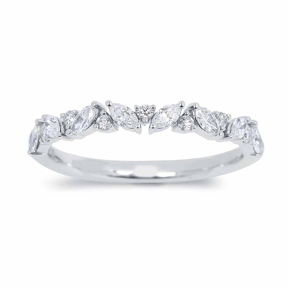 8 Marquise (szilvamag formájú) és 8 briliáns (kerek) csiszolású gyémánt kövekkel felváltva díszített gyémánt gyűrű. Mindegyik drágakő úgy van foglalva, hogy belesimuljon a gyűrű ívébe, így szépséges és kényelmesen hordható mintát alkotnak. A gyémántok összesen 0,37 karát súlyt tesznek ki, mindegyik F színű és VS tisztaság besorolással rendelkezik, a gyűrű felületének közel felét borítják. A gyűrű szélessége mindössze 2,3mm, több gyűrűvel is együtt hordható. A markíz gyémánt gyűrű 14 karátos fehéraranyból készült, súlya 2,1 gramm. 2-3 számot tudunk igazítani a méretén, díjmentesen. Készletről megvásárolható.