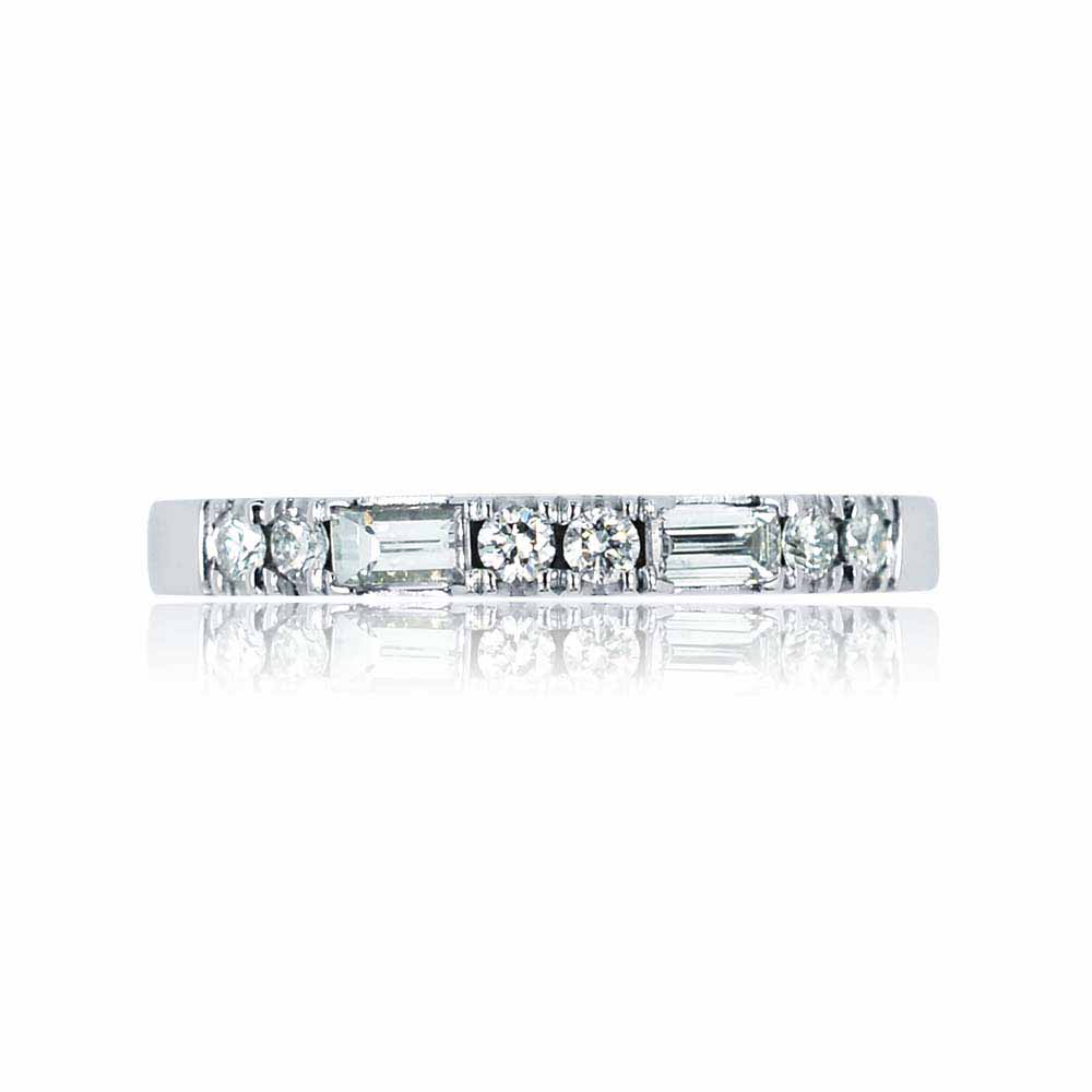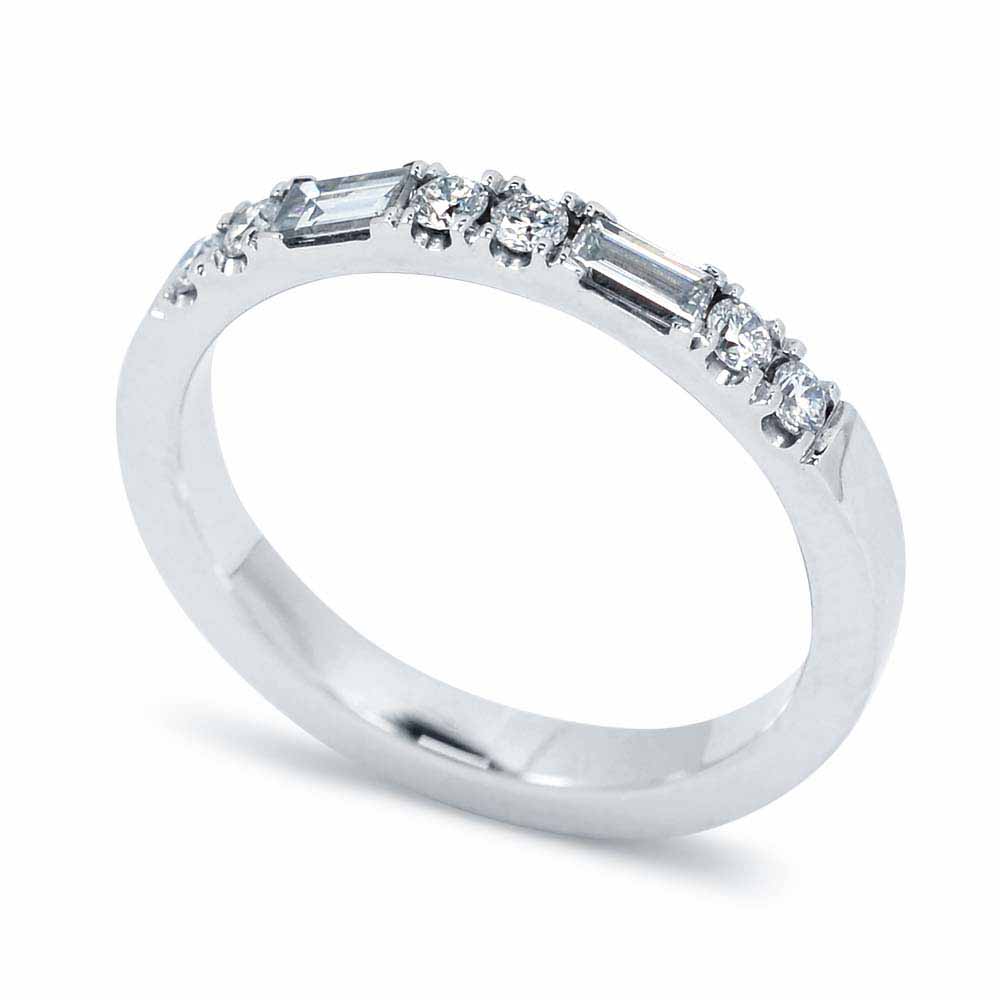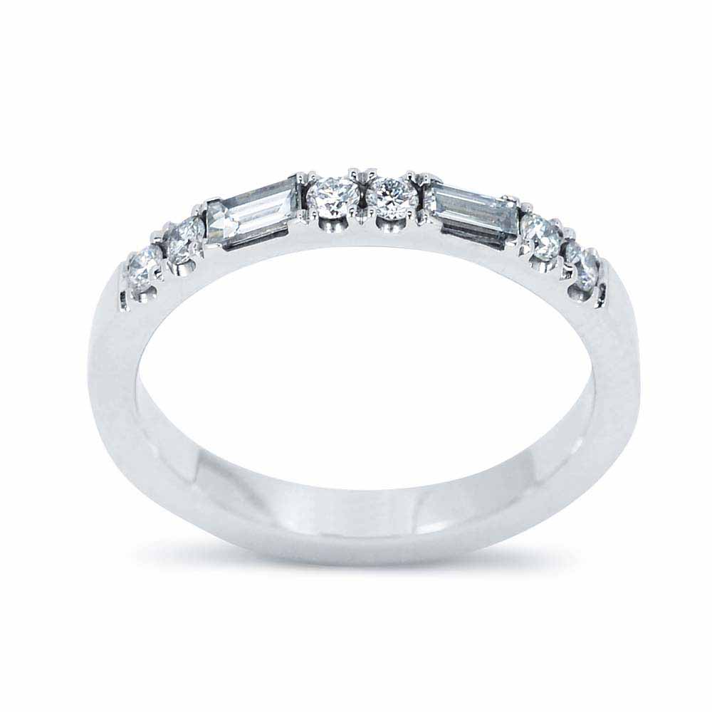 Két bagett (hosszúkás) és hat briliáns (kerek) csiszolású gyémánt kővel készített sorköves gyűrű. A gyűrűn 2 kerek követ egy hosszúkás követ. Mindegyik úgy van foglalva, hogy szépen belesimulnak a gyűrű ívébe. A gyémántok összesen közel 0,35 karát súlyt tesznek ki, mindegyik G színű és magas tisztaság besorolással rendelkezik. A bagett gyémánt gyűrű 14 karátos fehér aranyból készült, súlya 2,8 gramm. 1-2 számot tudunk igazítani a méretén, díjmentesen. Jelenleg megrendelésre.