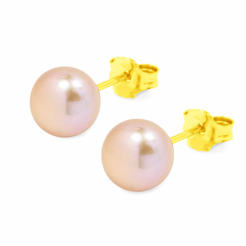 8-8,5mm-es átmérőjű barack rózsaszín édesvízi igazgyönggyel foglalt srófos rosegold fülbevaló. 14 karátos aranyból készítve, magas minőségű (AAA), valódi tenyésztett gyönggyel. Az édesvízi gyöngyök szabályos kerek formájúak és tökéletes lüsztrével rendelkeznek, színük természetes eredetű. Az igazgyöngy fülbevaló pár súlya összesen 2,7 gramm. Készletről megvásárolható.