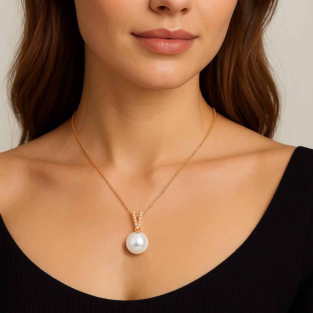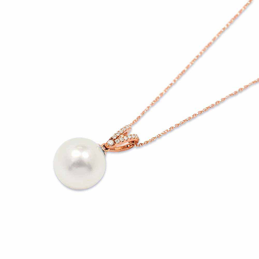 10,0mm átmérőjű és kiváló minőségű (AAA), édesvízi igazgyöngyös medál közel 0,1 karátnyi gyémánttal kirakva. A szabályos kerek édesvízi igazgyöngy fehér gyöngyházfényű, magas lüsztréjű. A medál felső részét 'V' formában számtalan briliáns kő díszíti, szép felületet alkotva. A medál tetszőleges láncra felfűzhető és 14 karátos rose aranyból készült. Súlya 2,1 gramm. Készletről megvásárolható.