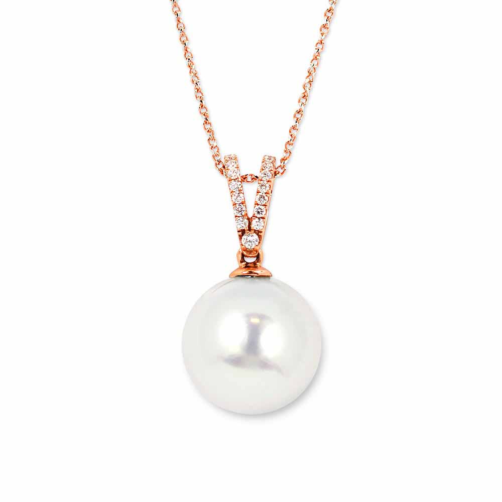 Nagy méretű (10,0mm), kiváló minőségű édesvízi igazgyöngyös medál 'V' formába gyémántokkal díszítve, rosegold