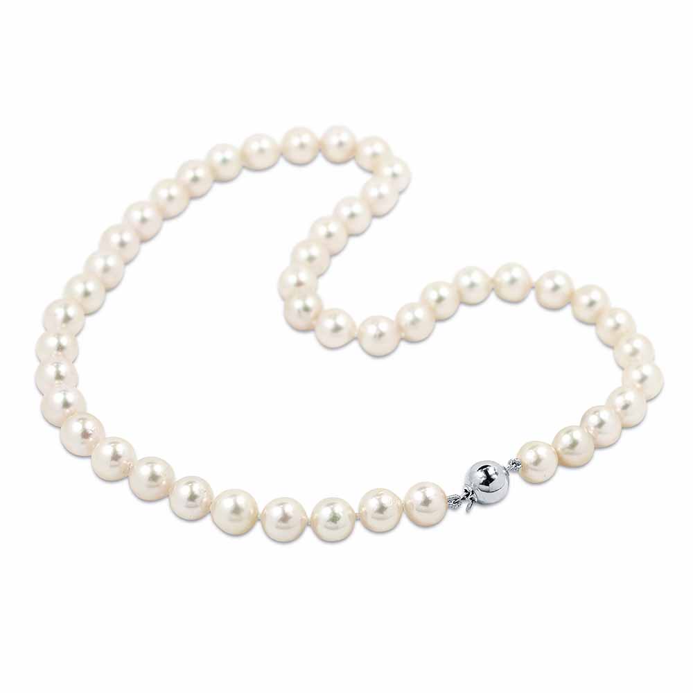 Magas minőségű (AAA) igazgyöngyök, gyönyörű fehér gyöngyházfényben sorba fűzve. Kerek formájú, 8-8,5mm-es átmérőjű tenyésztett édesvízi igazgyöngyökből fűzött sor. Az édesvízi igazgyöngy nyaklánc teljes hossza 45,0cm és hozzá illő ezüst gömb zár fogja össze. Minden gyöngyszem egyenként csomózott és a teljes gyöngy nyaklánc súlya 40,6 gramm. Keresd a hozzá illő karláncot is! Jelenleg megrendelésre.