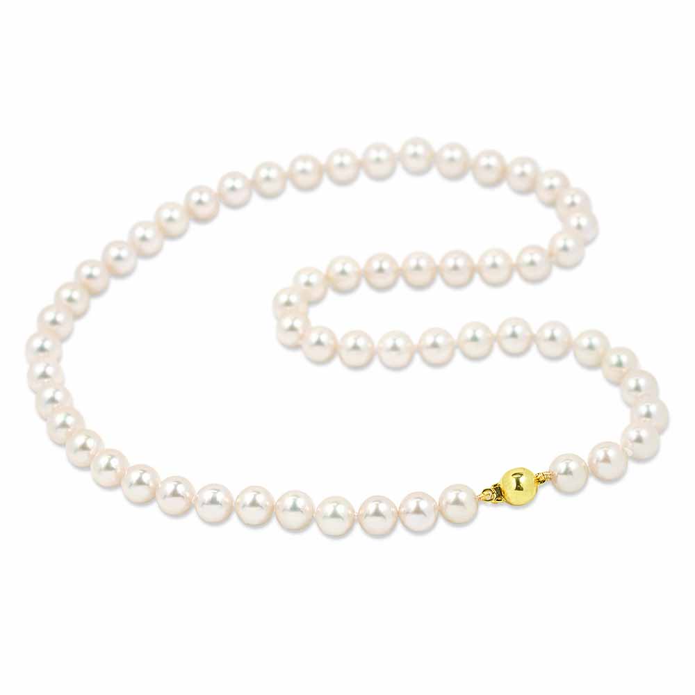 6,5-7mm-es átmérőjű, szép minőségű (AA), erős gyöngyházfényű fehér, sósvízi tenyésztett (akoya) igazgyöngyökből fűzött sor. A kézzel fűzött, egyenként csomózott gyöngy nyaklánc hossza 60,0cm és egy 14 karátos aranyból készült, gömb formájú zár tartja össze, biztonságban. A gyöngysor teljes súlya 34,4 gramm, a gyöngyök felületén enyhe növekedési hibák felfedezhetőek. Készletről megvásárolható.