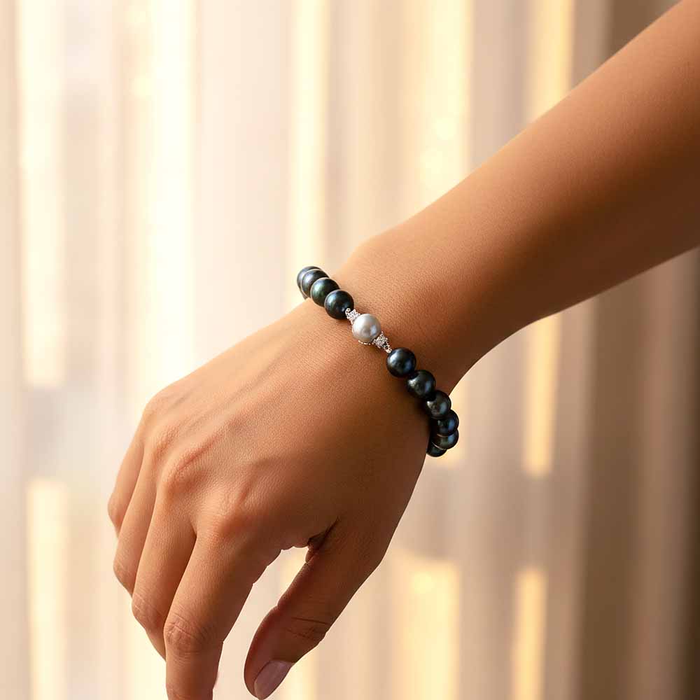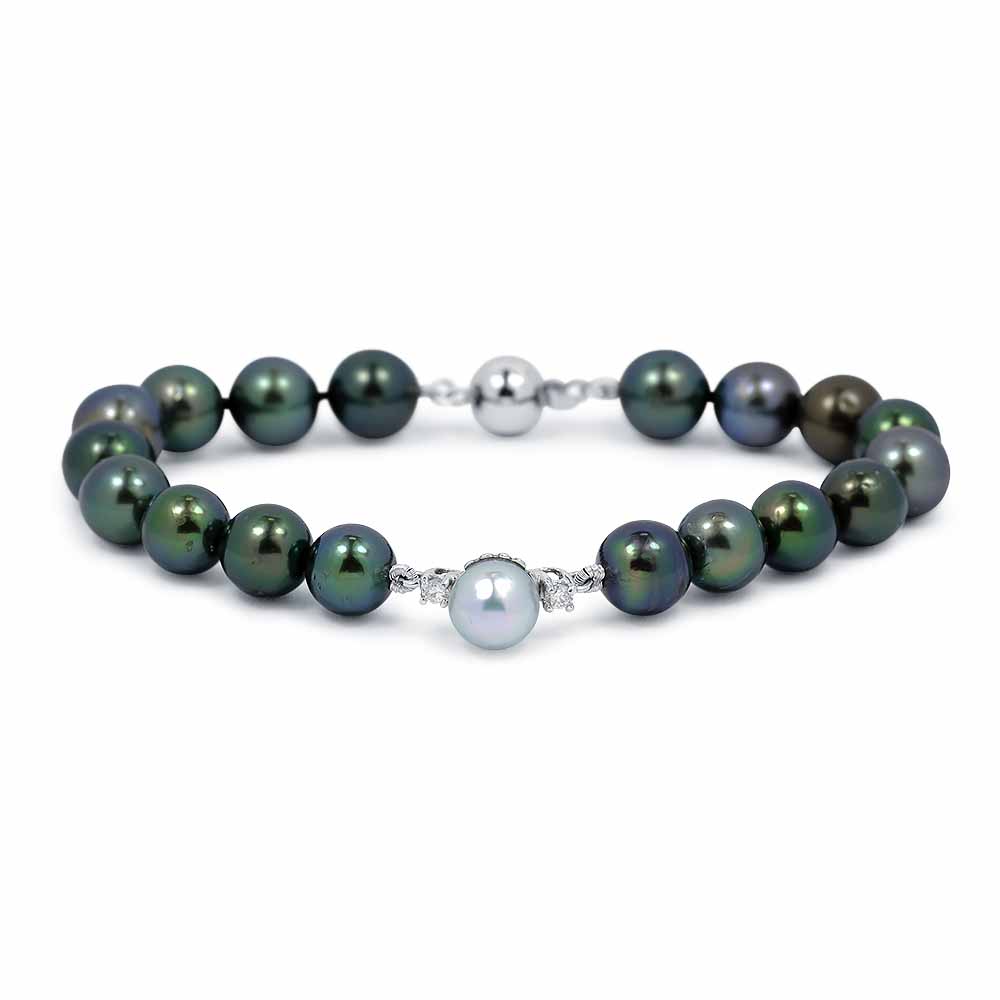 Középen kék akoyával és gyémántokkal ékesített tahiti gyöngy karkötő