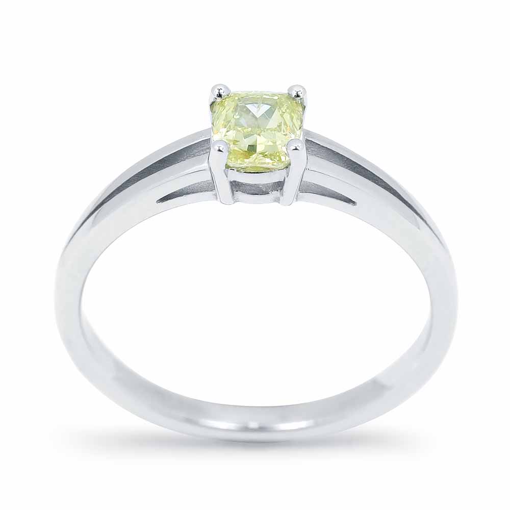 Fehéraranyból készült egyedi eljegyzési gyűrű fél karátos természetes, sárga gyémánttal. A központi gyémánt cushion (párna) formára van megcsiszolva, ami enyhén négyszögletes formát takar. A gyémánt színe is természetes eredetű, különleges zöldes-sárga árnyalatú. A gyémánt követ négy karom tartja biztonságban, melyhez kettéváló oldalsó (sín) rész párosul. A sárga gyémánt eljegyzési gyűrű súlya 2,2 gramm. Kérésre díjmentesen méretre igazítjuk. Készletről megvásárolható.