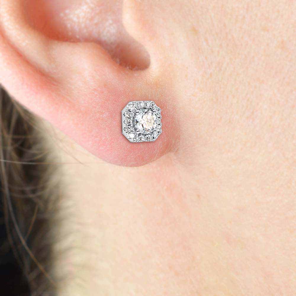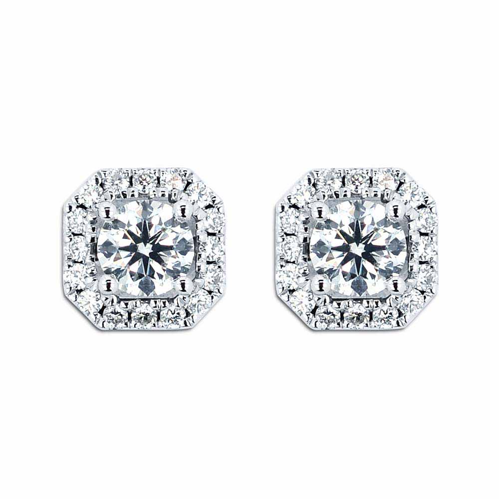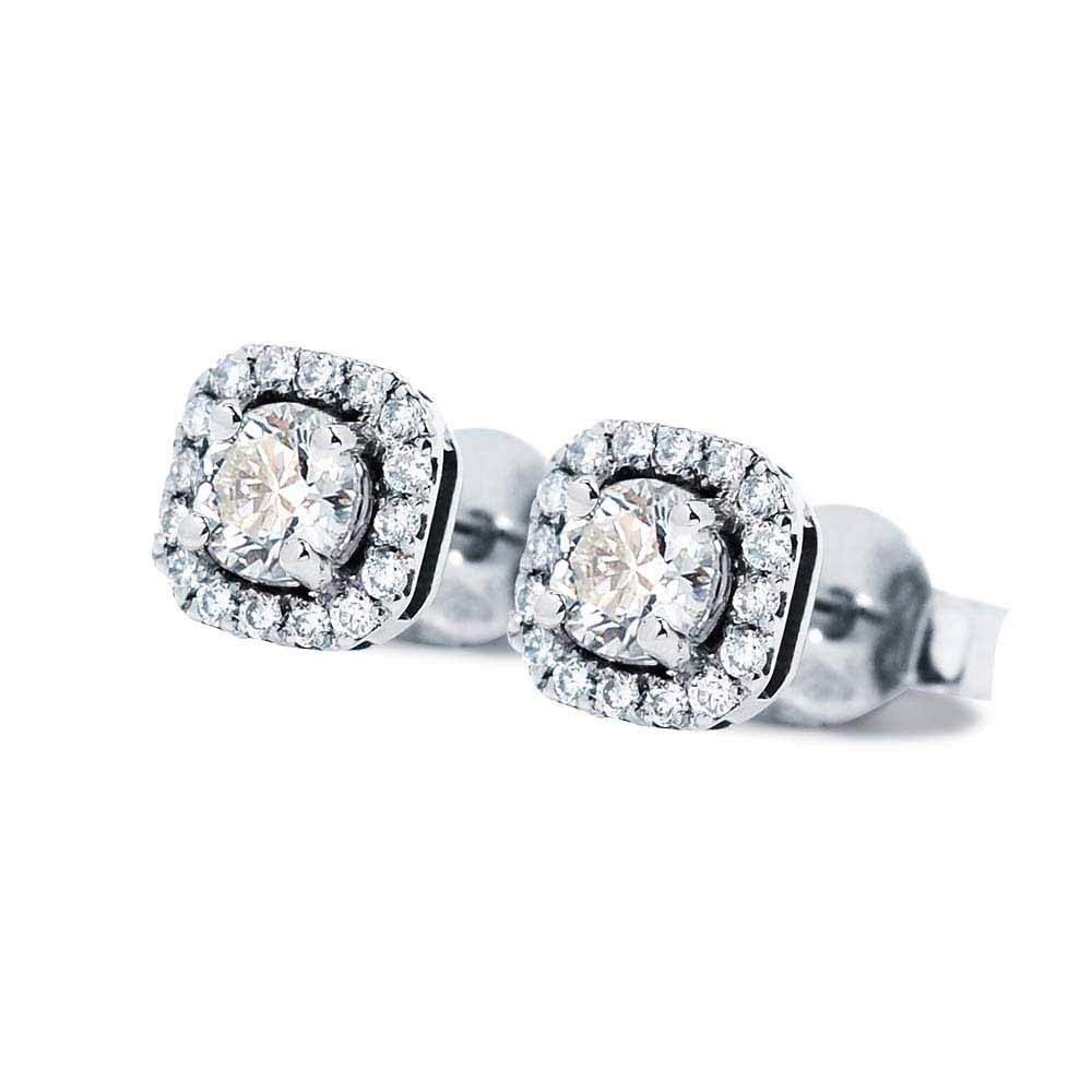 Szögletes formájú fülbevaló, körbe rakva briliáns kövekkel, középen pedig egy-egy nagyobb méretű (4,0mm-es) gyémánttal. A fülbevalóban összesen közel 0,7 karát magas minőségű gyémánt (F szín, VS tisztaság) csillog és 14 karátos fehér aranyból készült. Hasonlóan a 'Halo' foglalatokhoz, a nagy gyémántok enyhén kiemelkednek a kis gyémántokkal foglalt keretből, hogy még több fény tudjon áthatolni rajtuk. Stekkeres (betűzős) zárral rögzül, a gyémánt fülbevaló pár teljes súlya 1,9 gramm. Gyémánt ékszer szett: Keresd a hozzá illő medált és gyűrűt is! Készletről megvásárolható.