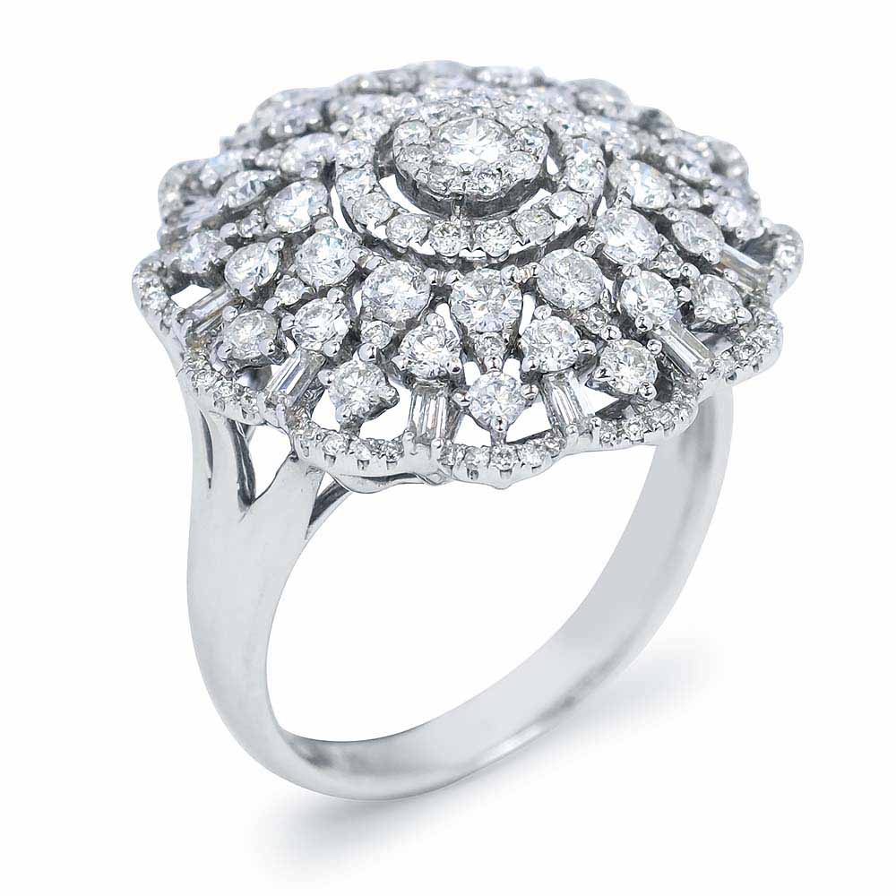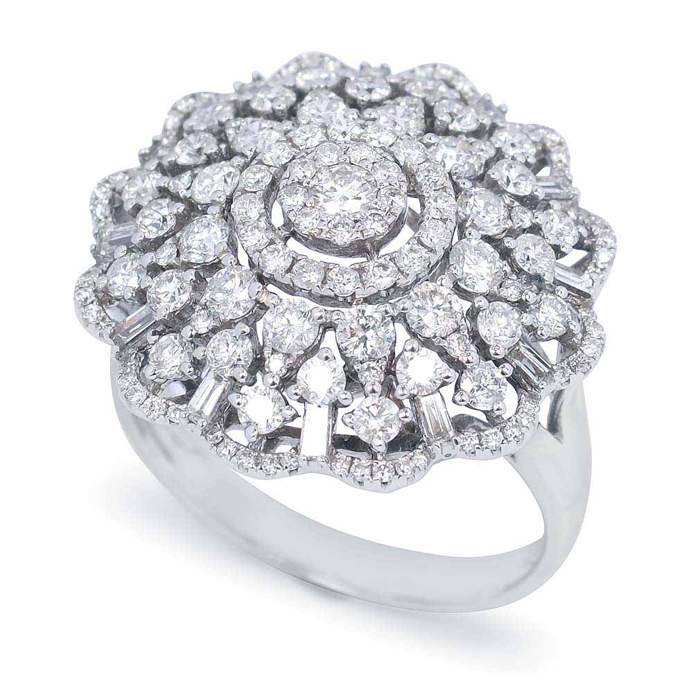 Eminence gyémánt gyűrű: Összesen 1,8 karátnyi természetes briliáns (kerek) és baguette (trapéz) formájúra csiszolt gyémántokkal díszített páratlan gyémánt gyűrű. Koktél gyűrű jellegét a gyűrű szembetűnő mérete adja, melyet 147 darab gyémánt kő alkot, domború kialakításának köszönhetően mégis kényelmesen hordható. A gyémánt gyűrű 18 karátos fehéraranyból kézzel készült, mindegyik drágakő kézzel került befoglalásra. A gyűrű díszének átmérője 22,0mm, a gyémántok szép fehér 'F-G' színbesorolással és 'SI' tisztasággal rendelkeznek. A briliáns és bagett gyémánt gyűrű súlya 6,0 gramm. Kérésre ingyenesen méretre igazítjuk, akár utólag is. Készletről elérhető.