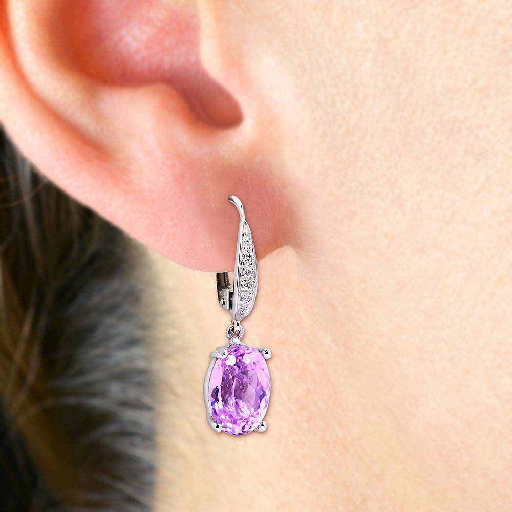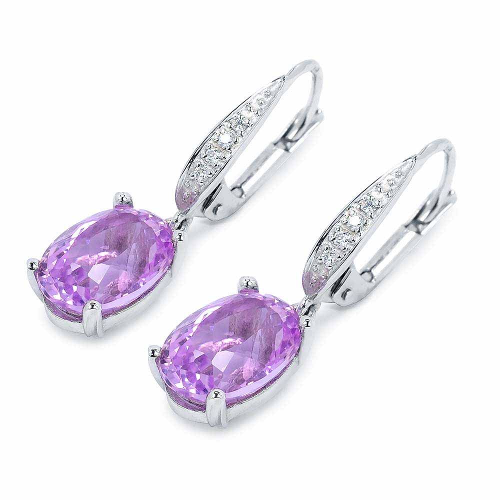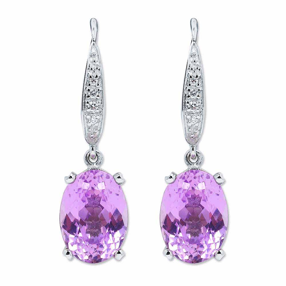 Ovális csiszolású ibolya lila kunzit kövekkel díszített fehérarany fülbevaló 4-4 gyémánttal