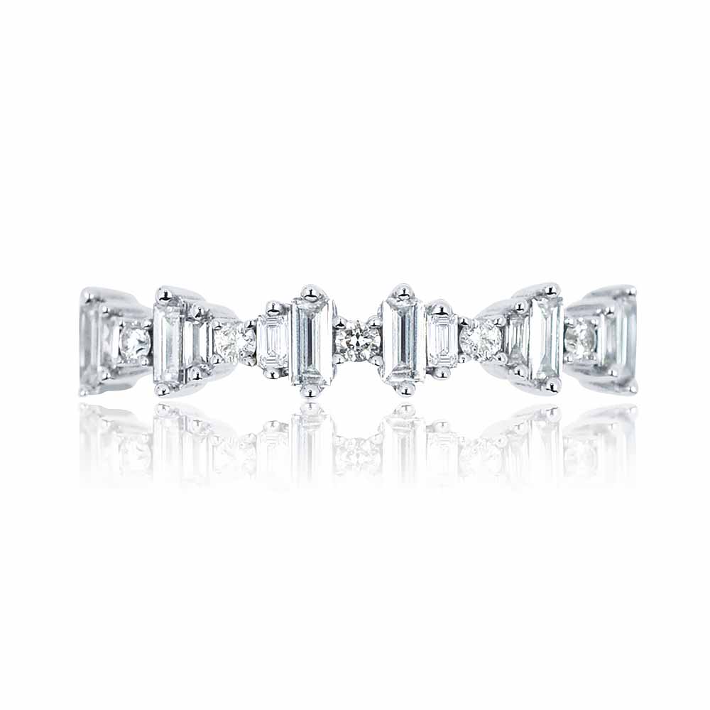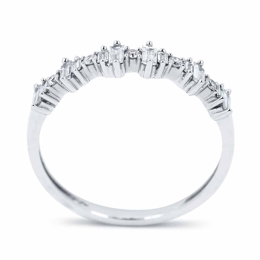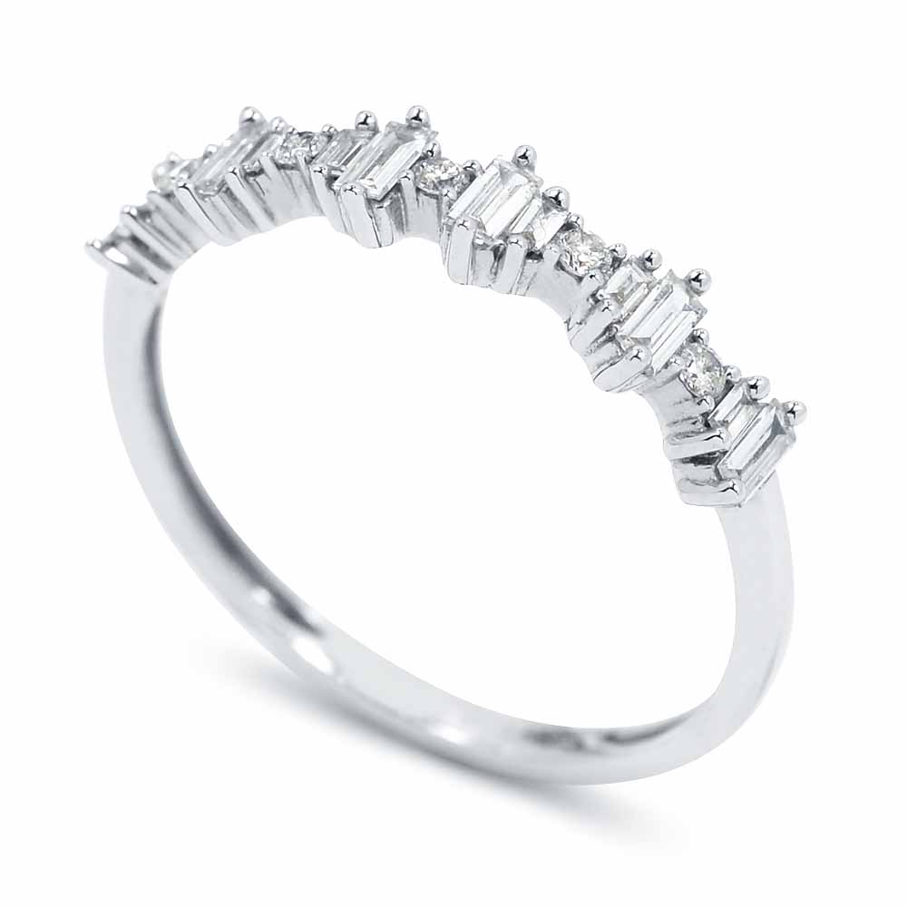 Különböző méretű, hosszúkás formára megcsiszolt (bagett) gyémánt kövekkel ékesített egyedi gyűrű. A gyűrűn egymás mellett sorakoznak a gyémántok, a bagett kövek 1-1 briliáns (kerek csiszolású) kő is. Az összes gyémánt súlya együttesen 0,31 karát, mindegyik hófehér és magas minőségű. A gyémánt gyűrű 18 karátos fehéraranyból készült, teljes súlya 1,7 gramm. Készletről megvásárolható. Szükség esetén díjmentesen méretre igazítjuk, de maximum 2-3 számot.