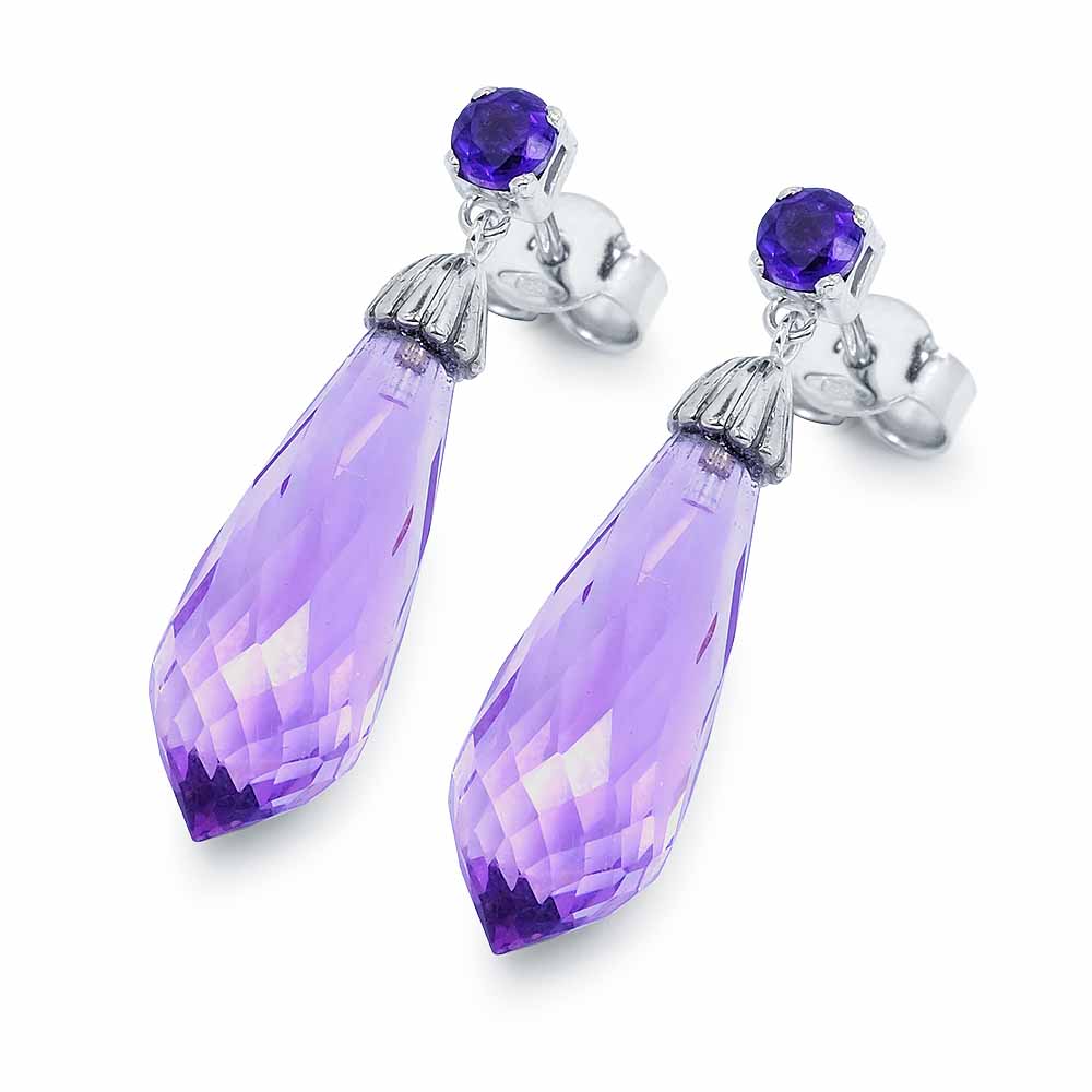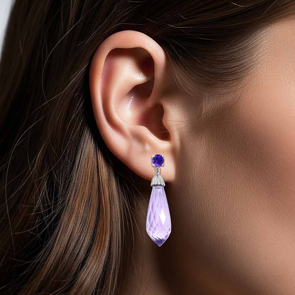 Egy-egy pendeloque csepp ametiszt drágakővel készült fülbevaló, fehéraranyból. A hosszúkás, lila ametiszt köveket fehérarany süveg tartja, melyek felett egy-egy kerek ametiszt kő kapott helyet karmos foglalatban. A fülbevaló lógó díszei láncszerűen vannak rögzítve, szabadon tudnak mozogni a cseppek. Mindegyik drágakő élénk színárnyalatú és zárványmentes, a 4 lila kő súlya 15 karát. Az ametiszt fülbevaló betűzős (stekkeres) zárral rögzül, mely a felső kerek kövek mögül nyúlik hátra. A drágaköves fülbevaló pár súlya 4,6 gramm, így a fülben is kényelmes. Készletről elérhető.