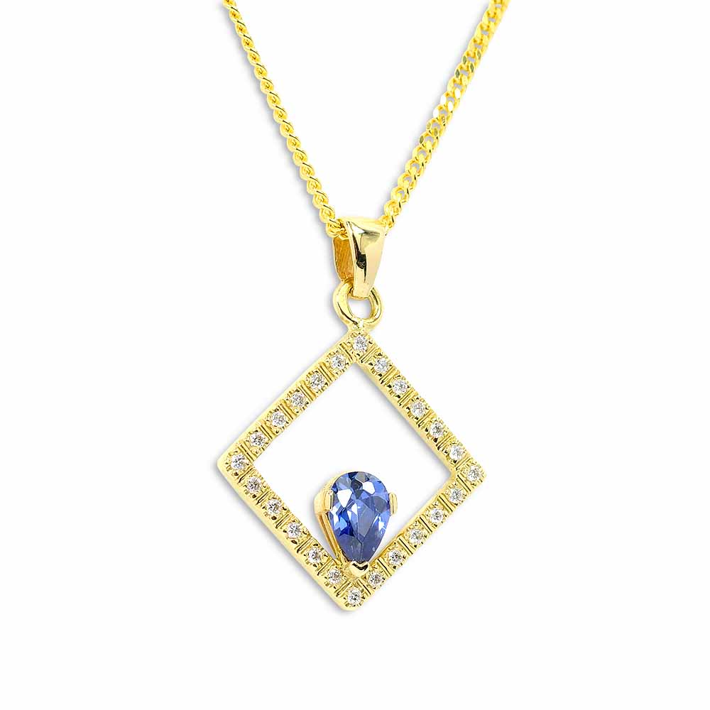Különleges arany medál csepp formájú, kék tanzanit kővel. A kék drágakövet egy négyszögletes keret övezi, mely végig apró gyémántokkal van kirakva. A tanzanit köves medál 14 karátos aranyból, kézzel készült. A tanzanit kő több, mint 0,6 karátos és a magas minőségű briliánsok is több, mint 0,1 karátot tesznek ki. A medál teljes súlya 1,8 gramm és tetszőleges láncra felhúzható. Elragadó kékség - Tanzanit ékszer. Készletről megvásárolható.