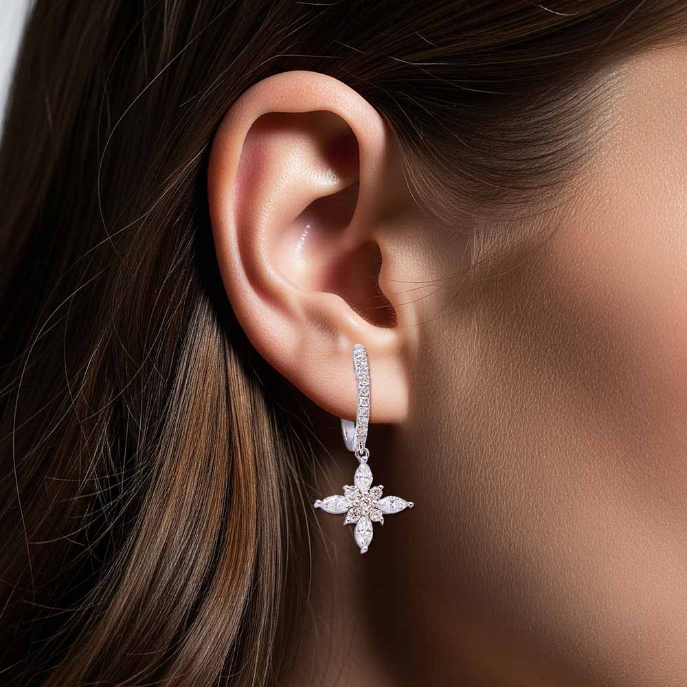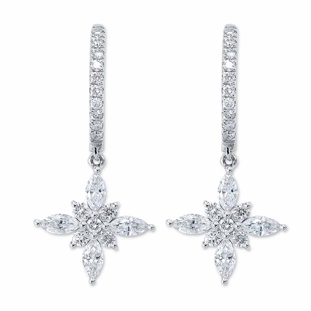 Marquise (szilvamag) formára megcsiszolt gyémántokkal készült fülbevaló különlegesség, 18 karátos fehéraranyból és összesen 0,71 karátnyi valódi gyémánt kővel. A fülbevaló fő éke a csillag forma, melynek ágait alkotják a markíz gyémántok, közepét pedig kerek briliánsok. A fülbevaló felső része karika jellegű, kettényitható, hogy könnyen be lehessen helyezni. A fülbevalót díszítő gyémántokmind magas minőségűek, F szín és VS-SI1 tisztaság besorolással rendelkeznek. A csillag gyémánt fülbevaló pár súlya 2,5 gramm. Készletről megvásárolható.