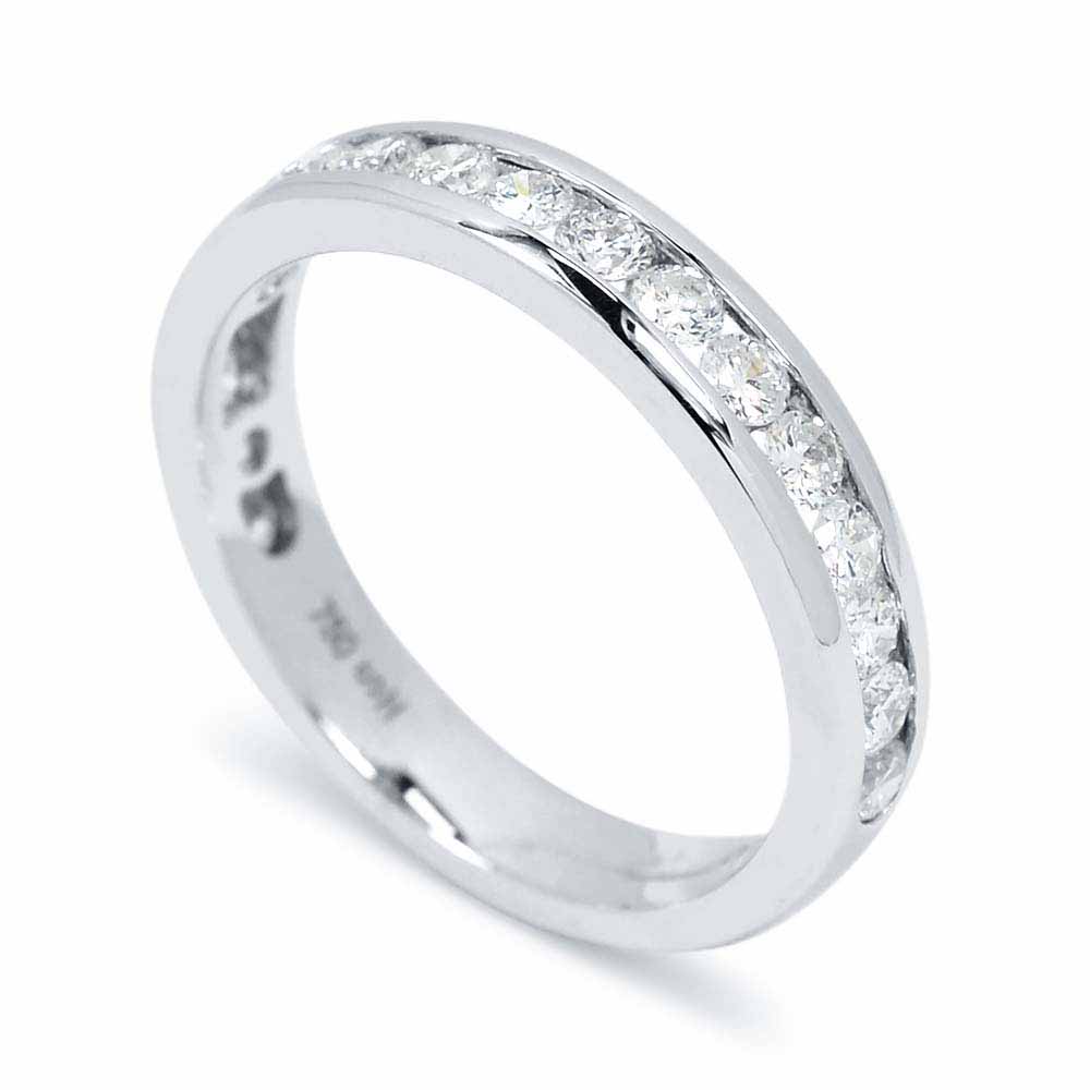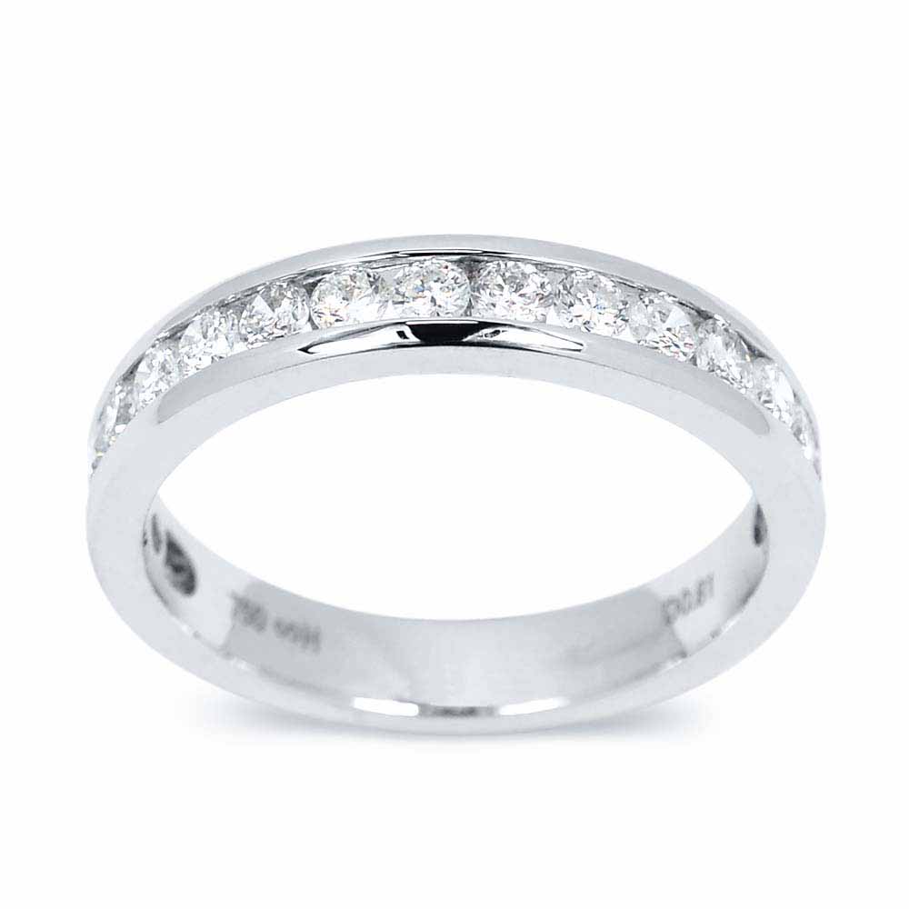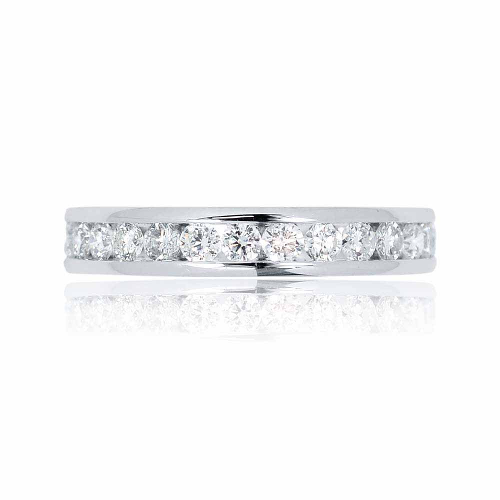 2,5mm-es átmérőjű, briliáns csiszolású gyémántokkal körbe foglalt fehérarany eternity gyémánt gyűrű. A gyűrűt 21 darab briliáns csiszolású gyémánt díszíti, melyek összesen több, mint 1,2 karátot tesznek ki. A gyémántokat channel setting (csatorna foglalat) tartja szorosan egymás mellett. A 21 darab gyémánt nem éri teljesen körbe a gyűrűt, 55-ös méretben 3-4 kő kihagyást jelent, hogy utólag is állítható legyen a gyűrű mérete. Kérhető teljesen körbe köves változatban is, azonban ha több gyémánt szükséges hozzá, akkor az a végső áron is változtat. Az eternity gyűrű 18 karátos fehérarany, súlya 3,4 gramm.