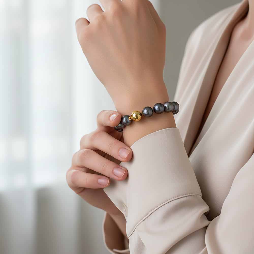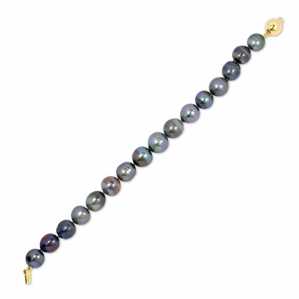 Fénylő, sötét lilás-fekete árnyalatú, enyhén szabálytalan formájú (barokk), tahiti igazgyöngyökből fűzött karlánc. A 10-12mm-es gyöngyökből fűzött sor teljes hossza 21,0cm és egy 14 karátos aranyból készült gömb zár fogja össze biztonságban. A gyöngysoron minden gyöngyszem egyenként csomózott, gyöngyházfényük kiamagasló. A tahiti gyöngy karlánc súlya 30,4 gramm, a gyöngyök minősítése 'BBB'. Akár férfi ékszernek is ajánljuk! Készletről megvásárolható, keresd a hozzá illő nyakláncot is. A tahiti gyöngyökről: Fekete igazgyöngyök - A tahiti gyöngyök rejtélye