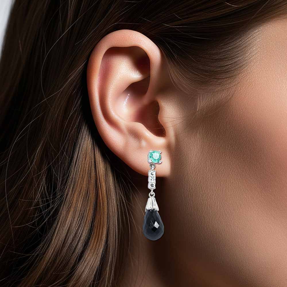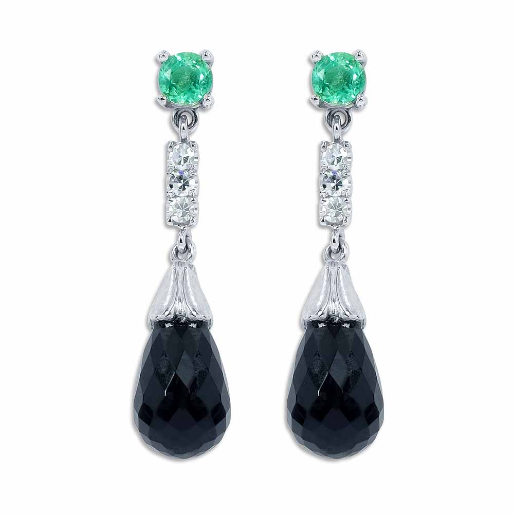 14 karátosfehéraranyból egyedileg készített onix lógós fülbevaló. A fülbevaló tetejét két zöld smaragd ékesíti, melyek alatt három-három gyémánt szemes láncon fekete onix csepp forma csüng. A fekete onix kövek pendeloque formára vannak megcsiszolva, felületük tükörfényes, így színárnyalatuk ellenére is szépséges csillogással rendelkeznek. A drágaköves fülbevaló pár teljes súlya 3,6 gramm. Készletről megvásárolható.